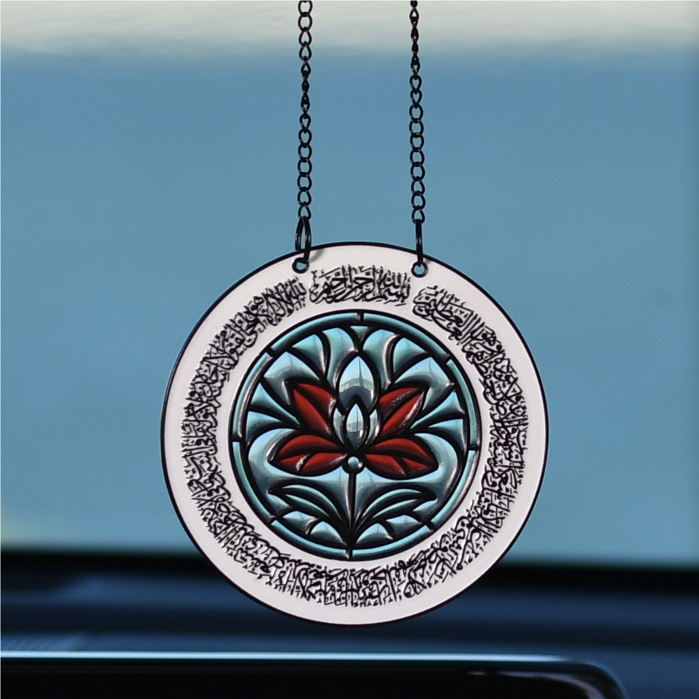 صُنعت هذه التعليقة الدائرية بقطر ٨ سم من معدن متين مطلي باللون الأسود الأنيق، لتمنحك لمسة من الفخامة والرفاهية. يتوسطها زجاج معشق ملون على شكل وردة، يضفي إشراقة ساحرة وألوانًا تنبض بالحياة. زُينت بزخرفة آية الكرسي بخط عربي راقٍ، محفور بدقة من الجهتين.